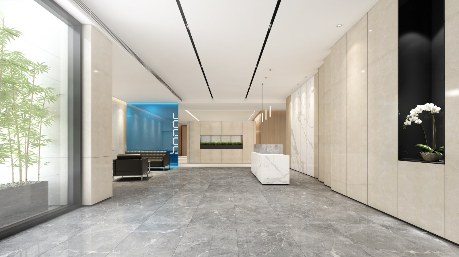 ? ?接待區的大廳要體現出企業大氣、明快的氛圍,對此,設計師們在規劃屏風隔斷時選用了玻璃的透明元素,并在墻體間保留了一定的靈活空間,實體墻面由層次分明、錯落有致的線條勾畫,并在室外配備綠植越過透明的玻璃,與室內的盆栽相呼應,組合成了簡潔、雅致的前廳。