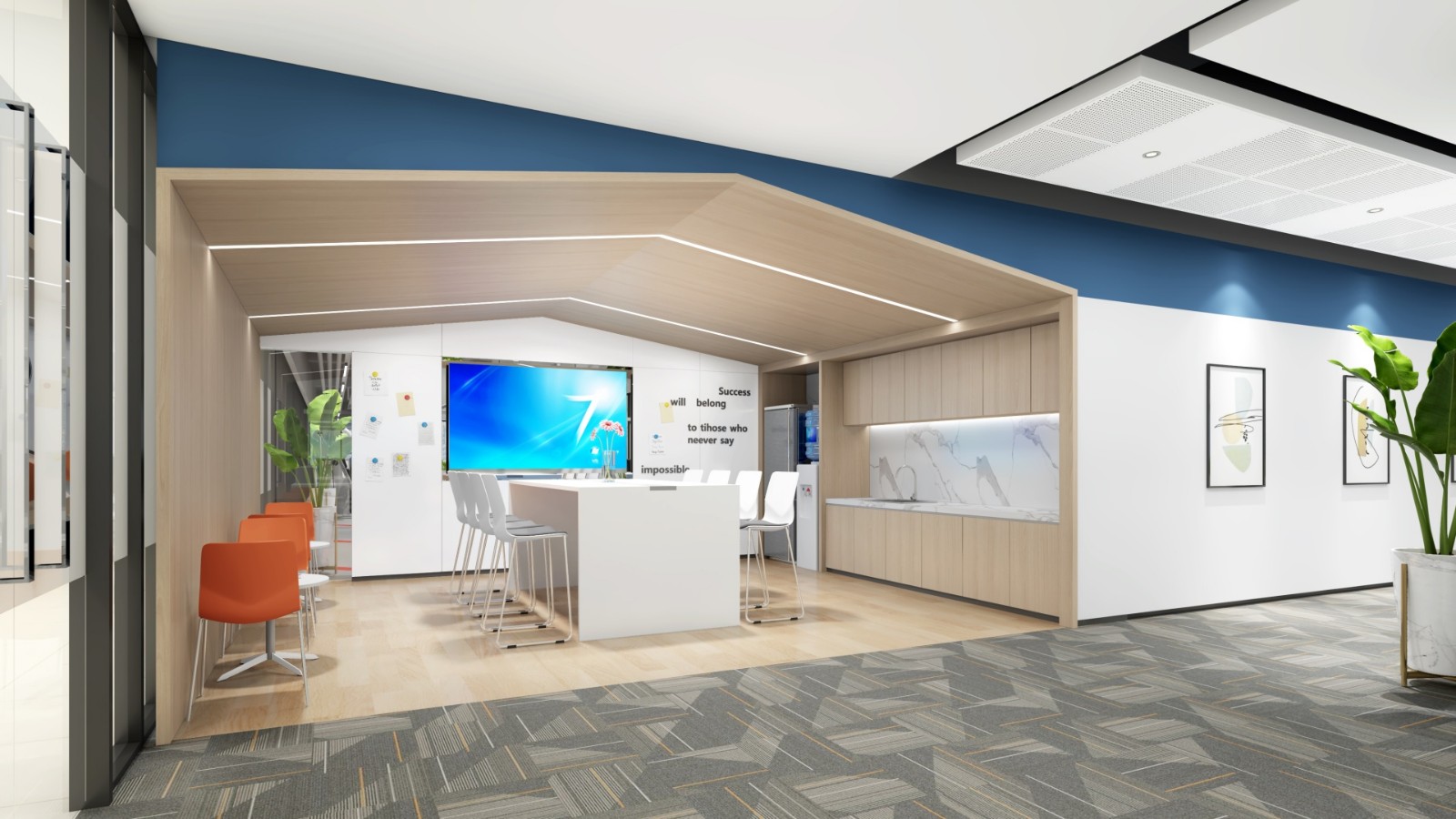 ? 清晰的棱角線,在墻體中鑲嵌出一個水吧,并配備顯示大屏,滿足休閑式的會議交流需求,突破了傳統休憩區的單一功能。