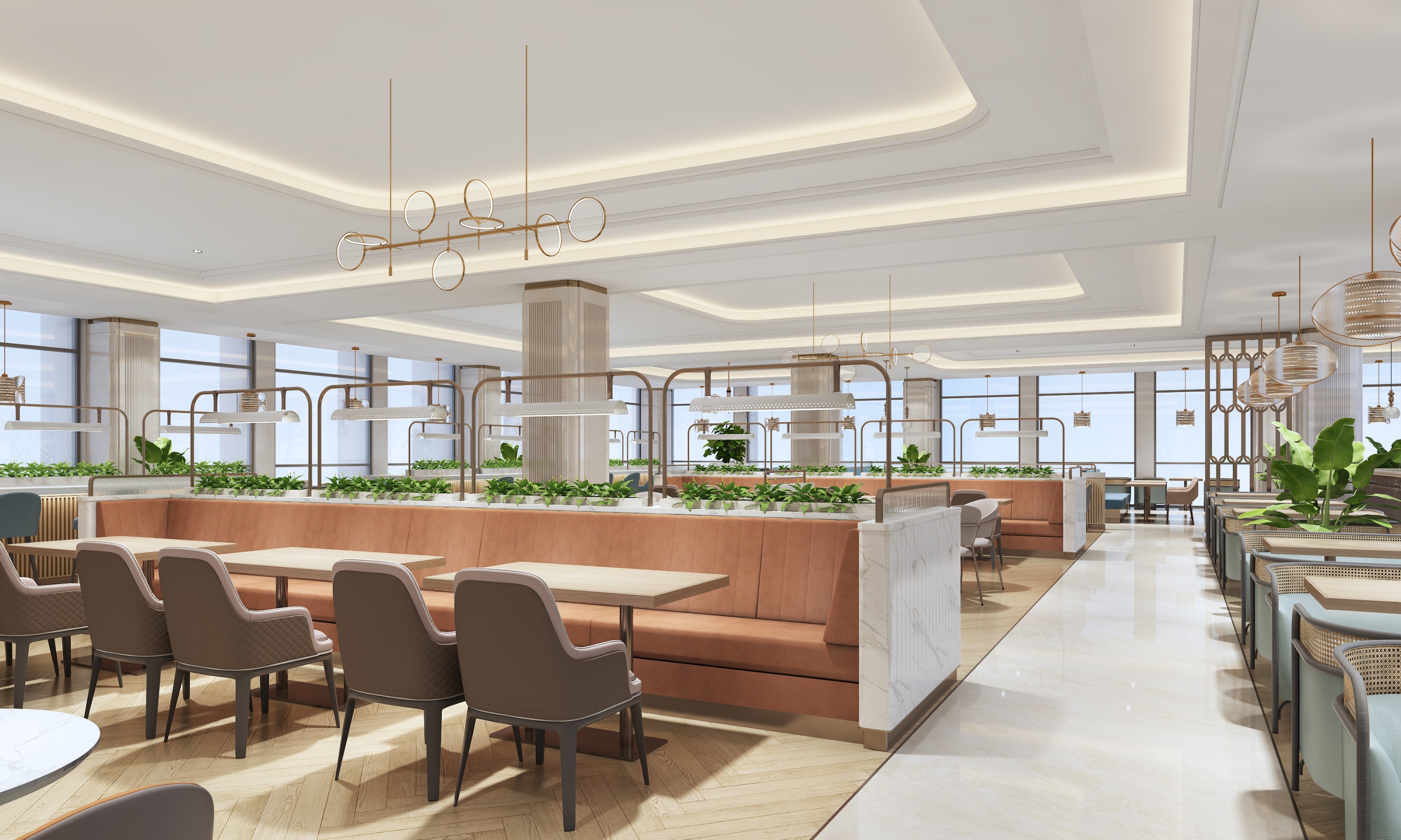 各種不同現代精致的隔斷屏風、裝飾吊燈和綠植點綴在整場環境中既有現代工業的精致細膩,又有綠植的自然氣息
